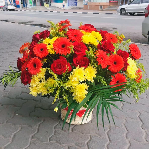 Стандартный (на фото): роза красная - 25 шт., гербера красная - 17 шт., хризантема кустовая желтая - 7 шт., солидаго - 10 шт., лист рабелини - 3 шт., салал, оазис, корзина.