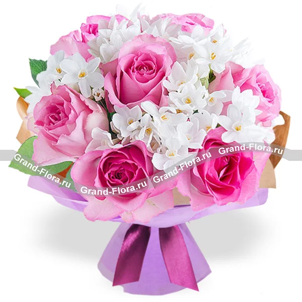 Люкс: роза розовая - 7 шт., нарциссы белые - 30 шт., упаковка, лента.
