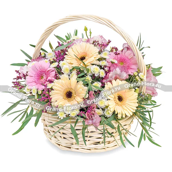 хризантема мини кустовая белая - 4 шт., гербера желтая - 3 шт., гербера розовая - 2 шт., эустома розовая - 2 шт., декоративная зелень, оазис, корзина.